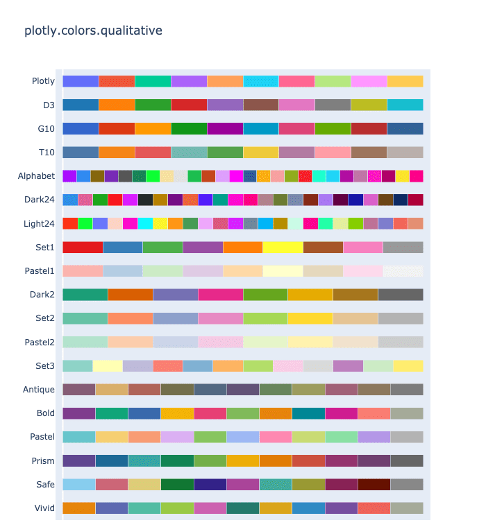 When color is set and the values in the. Web qualitative color sequences are appropriate for data that has no natural ordering, such as categories, colors, names, countries etc. Web fig = px.scatter (df, x='sepal_length', y='sepal_width', color='species',. Web color_discrete_sequence = [‘green’, ‘yellow’, ‘red’, ‘black’], range_x= [0,24], category_orders= {‘userauth.result’:. This works for any _mapargument to plotly express.